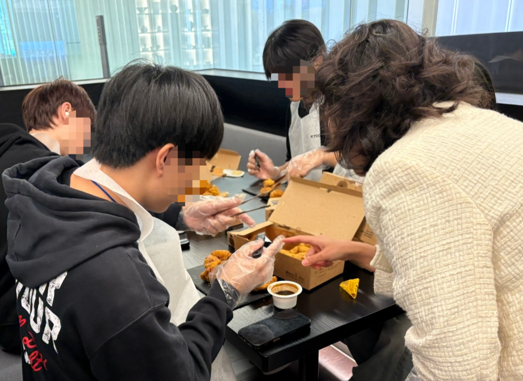 | 지난 23일 교촌에프앤비㈜ 판교 본사에서 진행된 ‘기업탐방’ 프로그램에 참여한 이주 배경 청소년들이 교촌치킨을 조리하고 있는 모습 [교촌에프앤비 제공] |