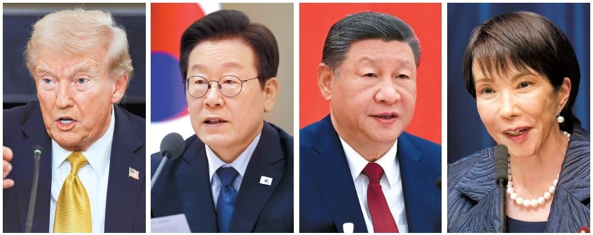 | 도널드 트럼프(맨 왼쪽) 미국 대통령이 오는 29일 방한, 아시아태평양경제협력체(APEC) 정상회의가 열리는 경주에서 이재명(왼쪽 두번째) 대통령을 만난다. 이튿날인 30일에는 시진핑(세번째) 중국 국가주석과 정상회담을 갖는다. 방한 전 27일~29일까지는 2박3일 일본을 방문해 다카이치 사나에(맨오른쪽) 총리와 회동한다. [로이터·연합·EPA·AP] |