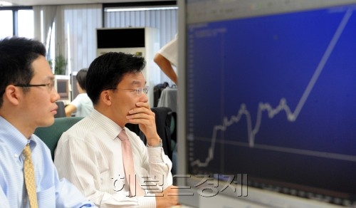 | 지난 2008년 을지로 외한은행 외환딜러들이 요동치는 환율을 보고 있다. [헤럴드DB] |