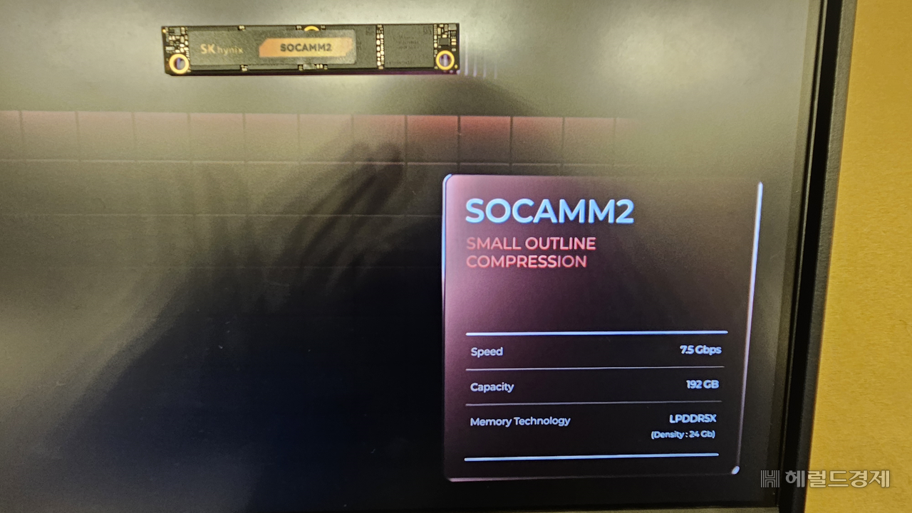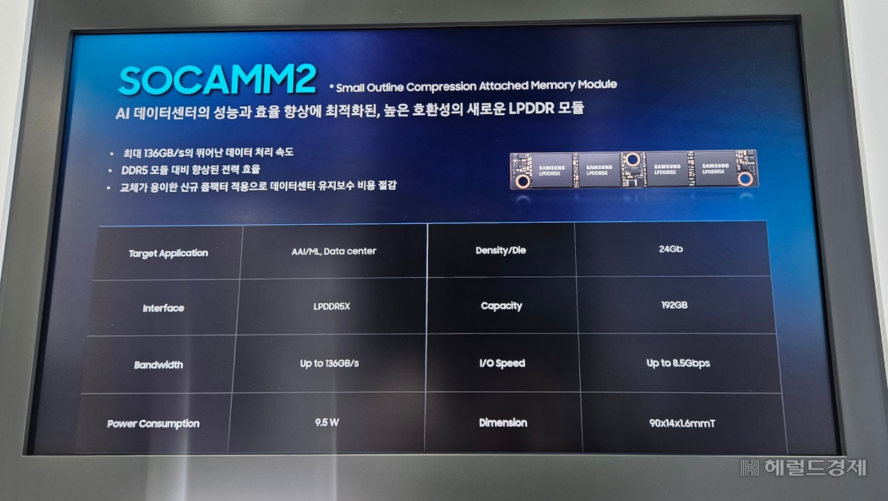 삼성전자와 SK하이닉스도 지난 22일 서울 강남구 코엑스에서 열린 반도체 대전(SEDEX 2025)에서 2세대 소캠 실물과 스펙을 전시했다. 양사 모두 LPDDR5X를 탑재, 용량은 192GB로 같았지만 삼성전자의 2세대 소캠은 입출력(I/O) 최대 속도가 8.5Gbps로 SK하이닉스(7.5Gbps)를 앞섰다. 다만 마이크론(9.6Gbps)보다는 다소 낮은 수준이다.