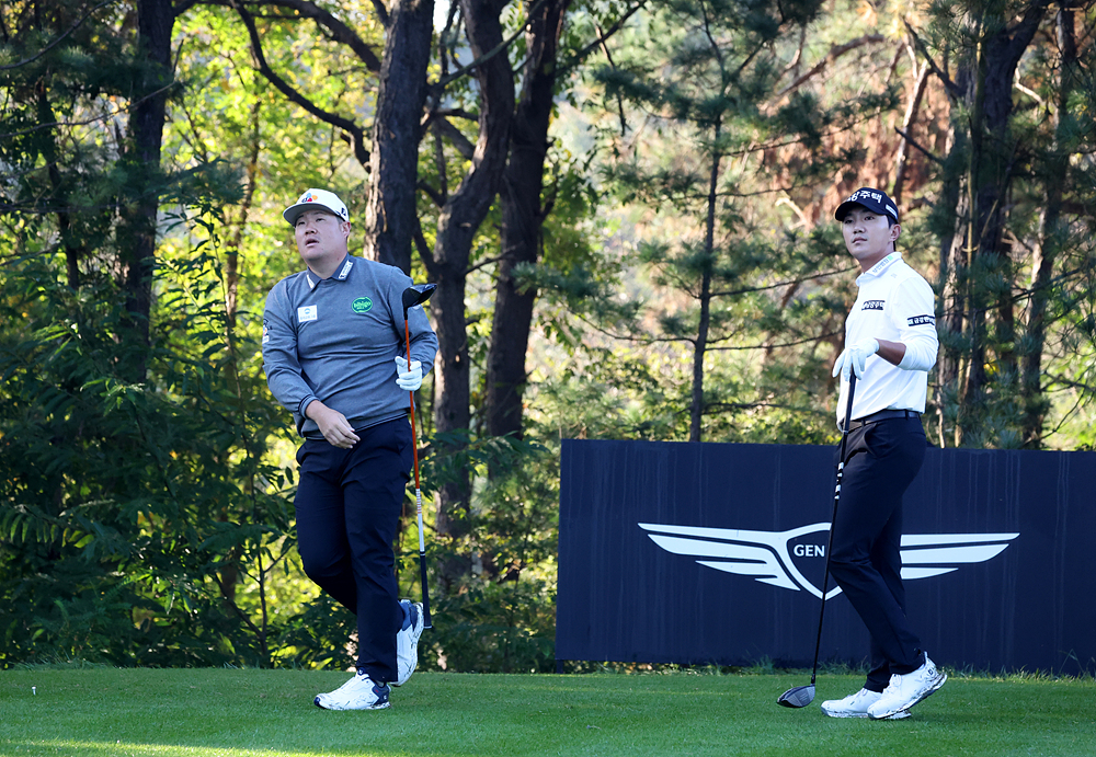 | 임성재가 동반 플레이어인 옥태훈이 지켜보는 가운데 12번 홀에서 티샷을 날리고 있다. [사진=KPGA] |