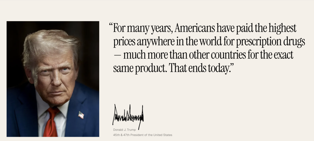 이 사이트는 2026년 1월 정식 오픈을 목표로 하고 있다. 현재까지 공개된 내용은 트럼프 대통령의 미국 내 약가인하 정책(최혜국 대우)과 관련된 홍보다. 최혜국 대우란 제약사가 특정 국가에 제공하는 가장 저렴한 가격을 미국에도 똑같이 적용한다는 뜻이다.