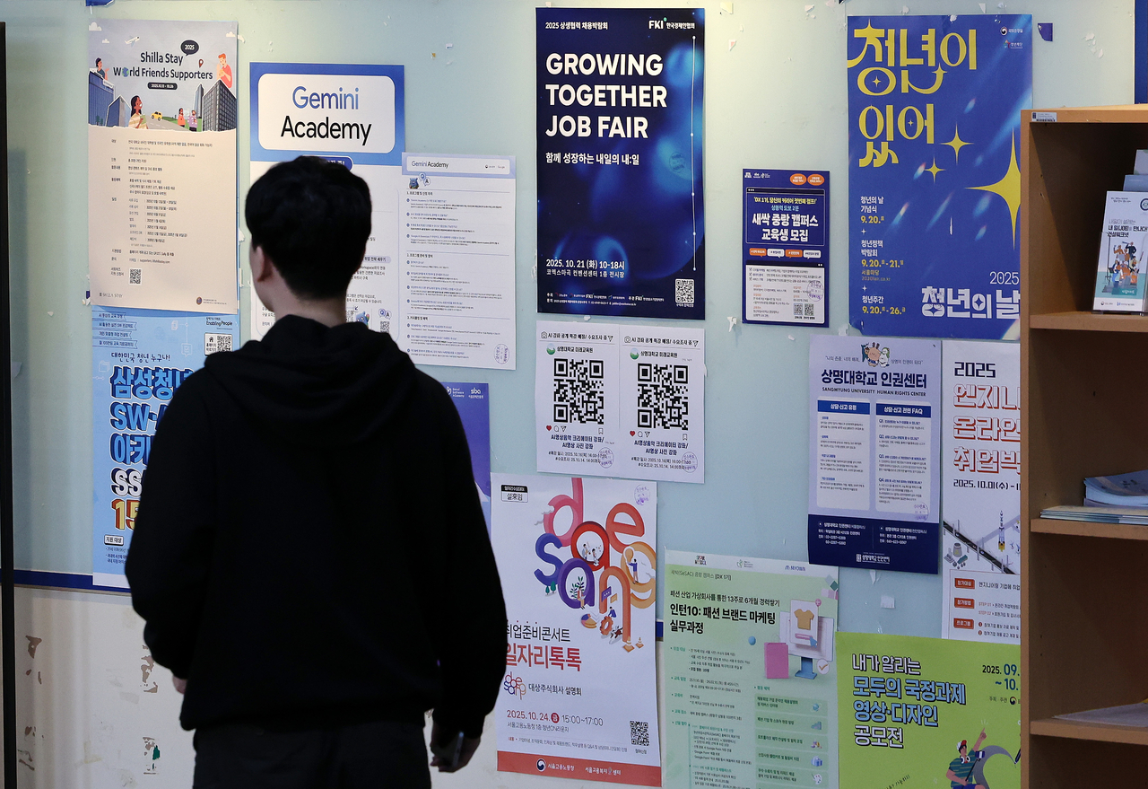 | 지난 20일 서울 시내 한 대학교 취업 게시판 앞을 학생들이 지나고 있다. [연합] |