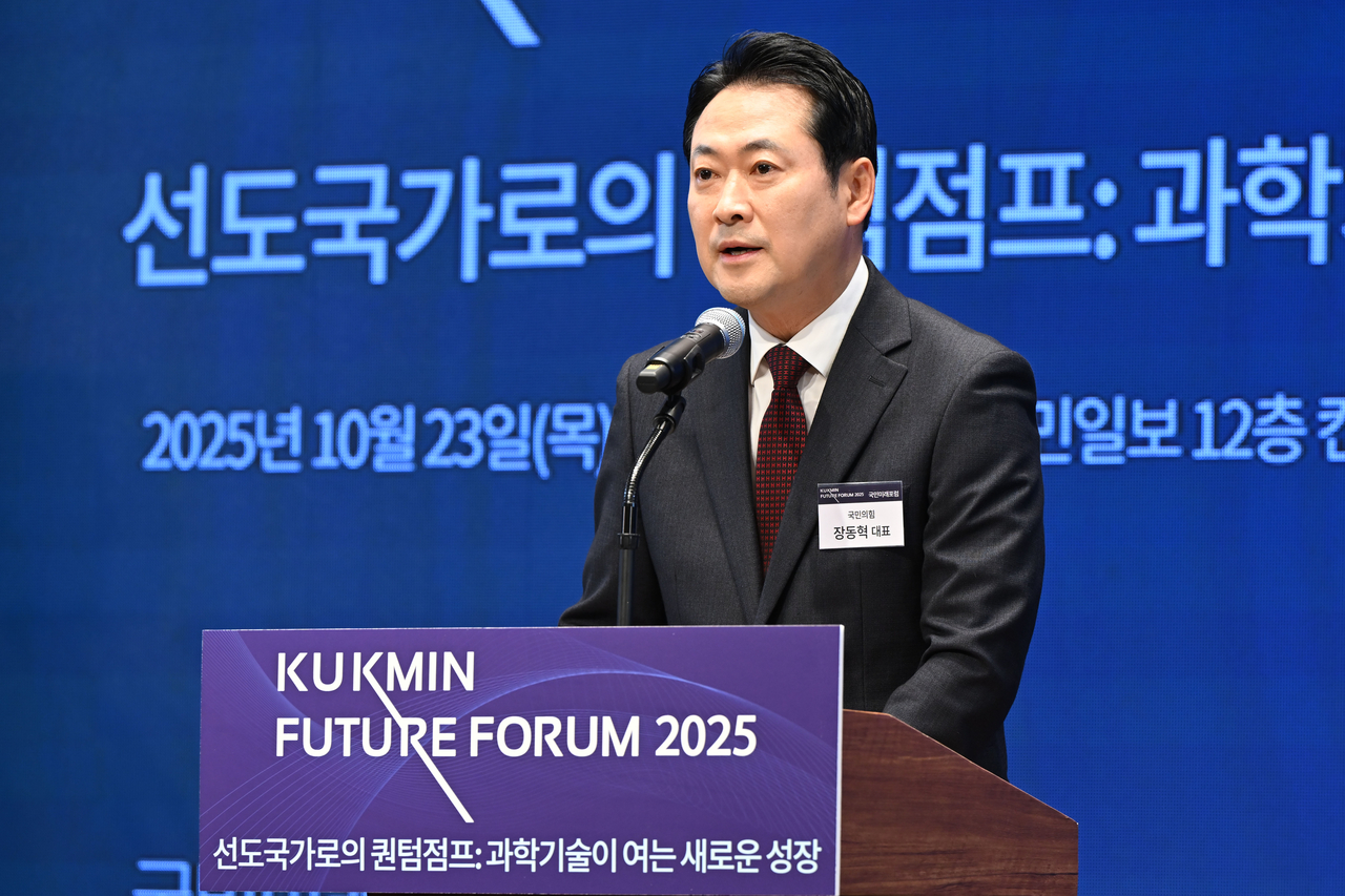 | 지난 23일 2025 국민미래포럼 ‘선도국가로의 퀀텀점프 : 과학기술이 여는 새로운 성장’이 열린 서울 영등포구 CCMM빌딩에서 국민의힘 장동혁 대표가 축사하고 있다. [연합] |