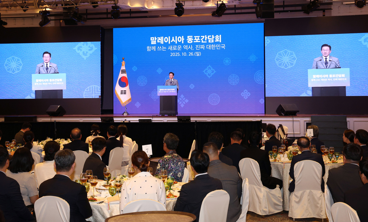 | 이재명 대통령이 26일 말레이시아 쿠알라룸푸르 한 호텔에서 열린 동포 만찬 간담회에서 인사말을 하고 있다. [연합] |