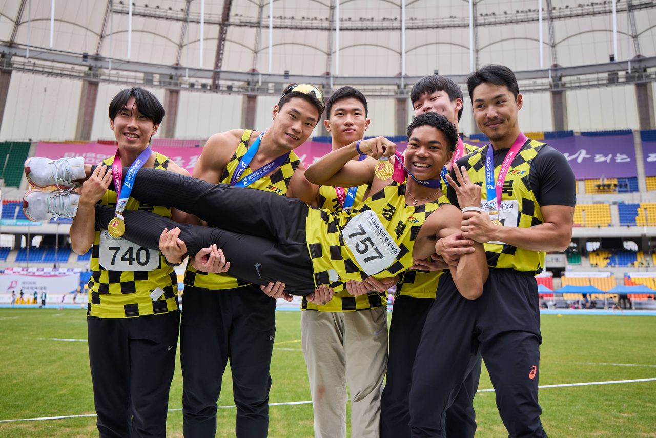 | 전국체전 육상 400m 계주 우승 후 기뻐하는 나마디 조엘진과 팀원들 [SKT 제공] |