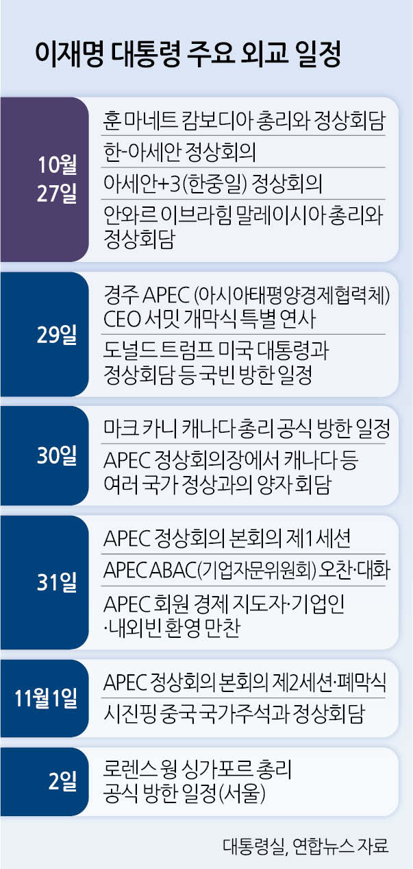또 30일엔 마크 카니 캐나다 총리의 공식 방한 일정과 APEC 정상회의장에서 여러 국가 정상과의 양자 회담 일정 등이 예정돼 있다. 다카이치 사나에 신임 일본 총리와도 같은 날 한일 정상회담에 나설 것이 유력한 상황이다. 다카이치 총리와 첫 정상회담에서 한일 관계 개선과 셔틀 외교 지속에 대한 공감대가 형성될지 여부가 관전 포인트가 될 전망이다.