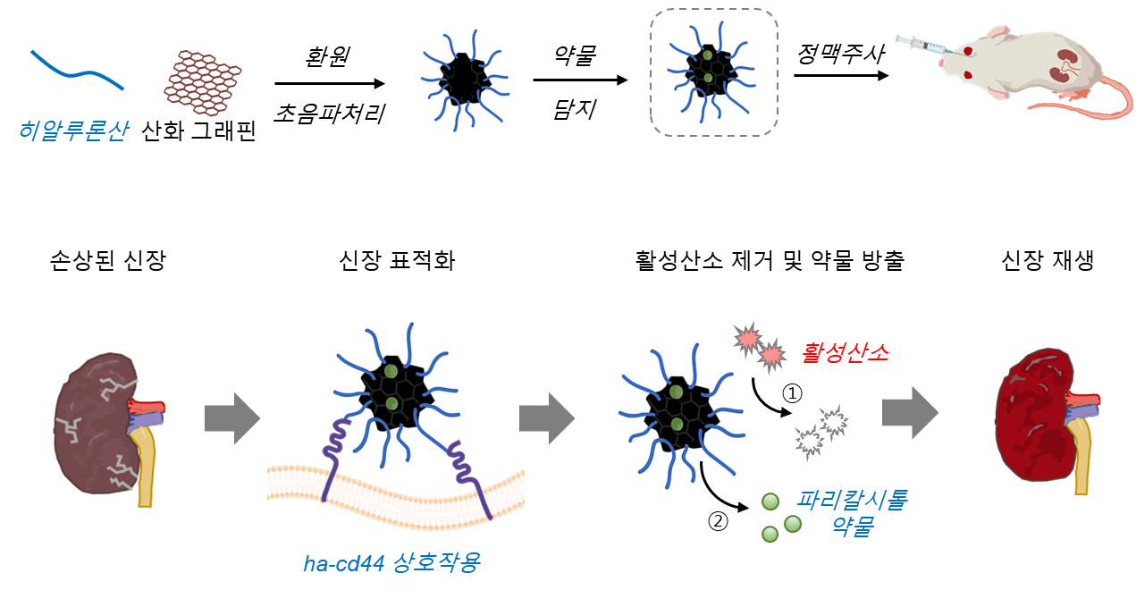 연구팀은 이러한 문제를 해결하기 위해, 신장 손상 부위에서 과도하게 생성되는 활성산소를 효과적으로 제거하면서 손상 부위에만 항섬유화 약물을 선택적으로 전달할 수 있는 그래핀 기반 지능형 나노의약 플랫폼을 개발했다.
