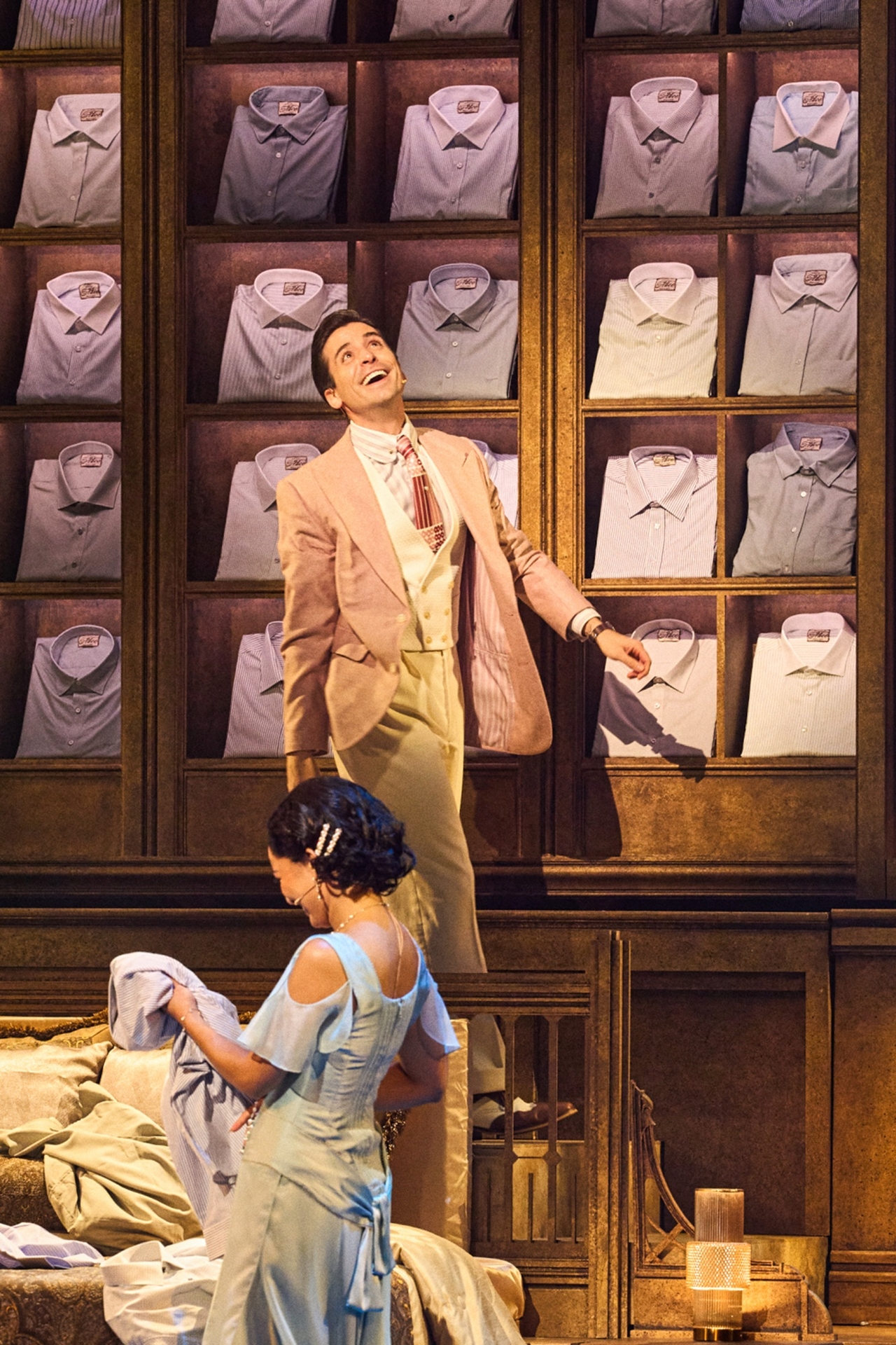 무대로 옮겨온 소설은 100년 전 이야기임에도 동시대성을 갖는다. 하울랜드는 “위대한 개츠비‘를 작업하며 이 이야기는 1922년만이 아니라 2022년에도 공명한다는 것을 느꼈다”며 “정말로 놀라운 소설이고, 전 세계 사람들에게 여전히 울림을 주는 작품”이라고 했다. 아메리칸드림과 신분 상승을 향한 끝도 없는 인간의 욕망이 물거품 같은 하룻밤 파티로 이어지고, 그 이면의 허상과 양면성이 무대 말미 덮쳐오면 관객은 소설 못잖은 여운에 휘감긴다. 마지막 장면에 나오는 ‘로어링 온’의 춤은 이 작품의 상징이다. 켈리는 “작품의 메시지를 가장 잘 담아낸 장면”으로 꼽는다.