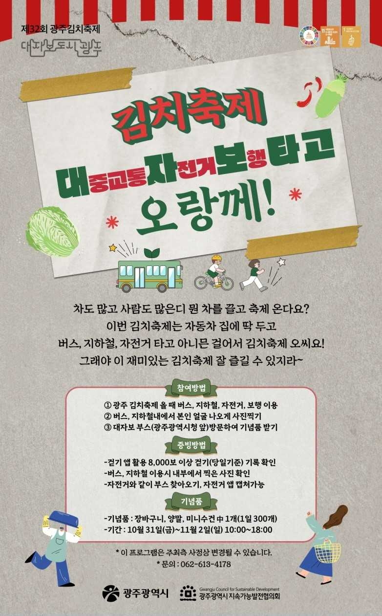 ‘대자보 챌린지’는 ‘승용차 대신 대중교통·자전거·보행으로 축제장 찾아오기’를 목표로 한다. 이를 달성·인증한 시민들에게는 현장에서 소정의 기념품(양말 세트·장바구니·미니 수건 중 1개)을 증정한다.
