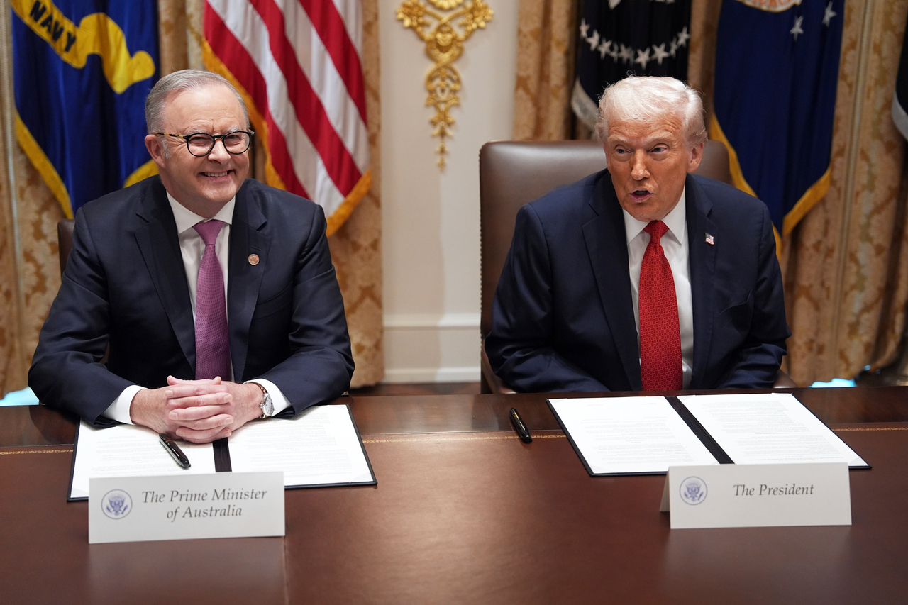 | 도널드 트럼프 미국 대통령(오른쪽)이 지난 20일(현지시간) 백악관 내각 회의실에서 앤서니 앨버니즈 호주 총리와 회담 중 발언하고 있다.[AP] |