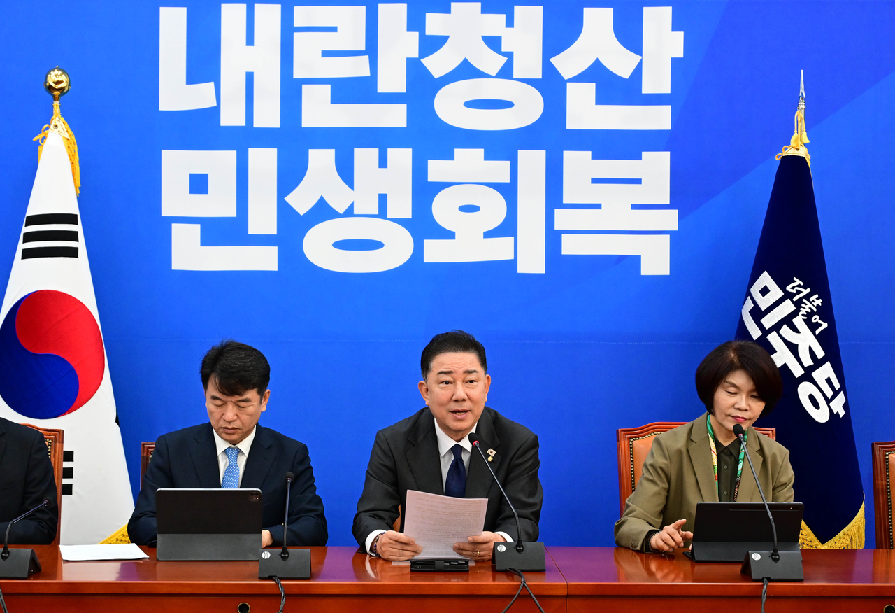 | 김병기 더불어민주당 원내대표가 28일 오전 서울 여의도 국회에서 열린 국정감사대책회의에 참석해 모두발언하고 있다. 이상섭 기자 |
