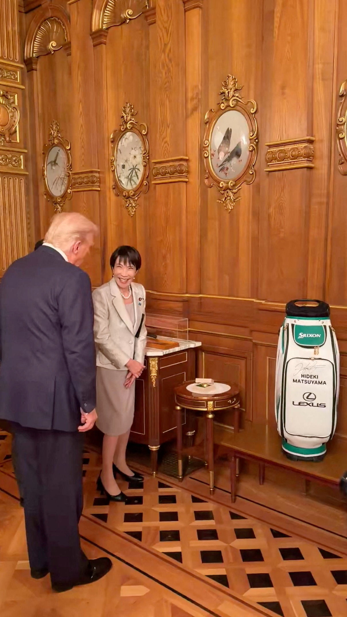 | 다카이치 사나에 일본 총리가 28일(현지시간) 도쿄에서 도널드 트럼프 미국 대통령에게 고(故) 아베 신조 전(前) 총리의 퍼터, 마츠야마 히데키 선수의 사인이 담긴 골프백, 금박 골프공을 선물하고 있다.[로이터 제공 영상 캡처] |