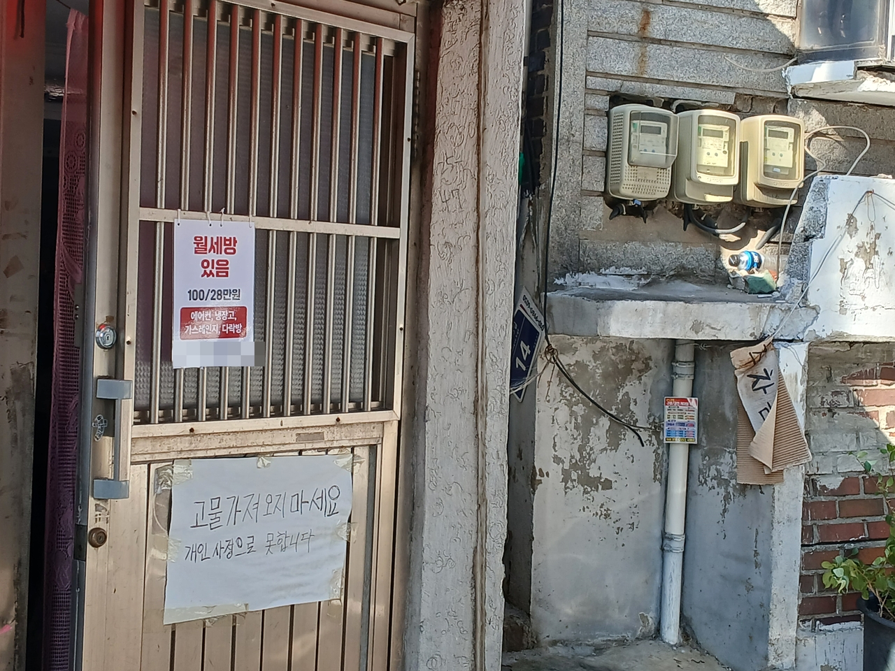 | 서울 구로구 가리봉2구역 내 한 주택에 보증금 100만원, 월세 28만원 세입자를 구하는 전단지가 붙어 있다. 김희량 기자 |