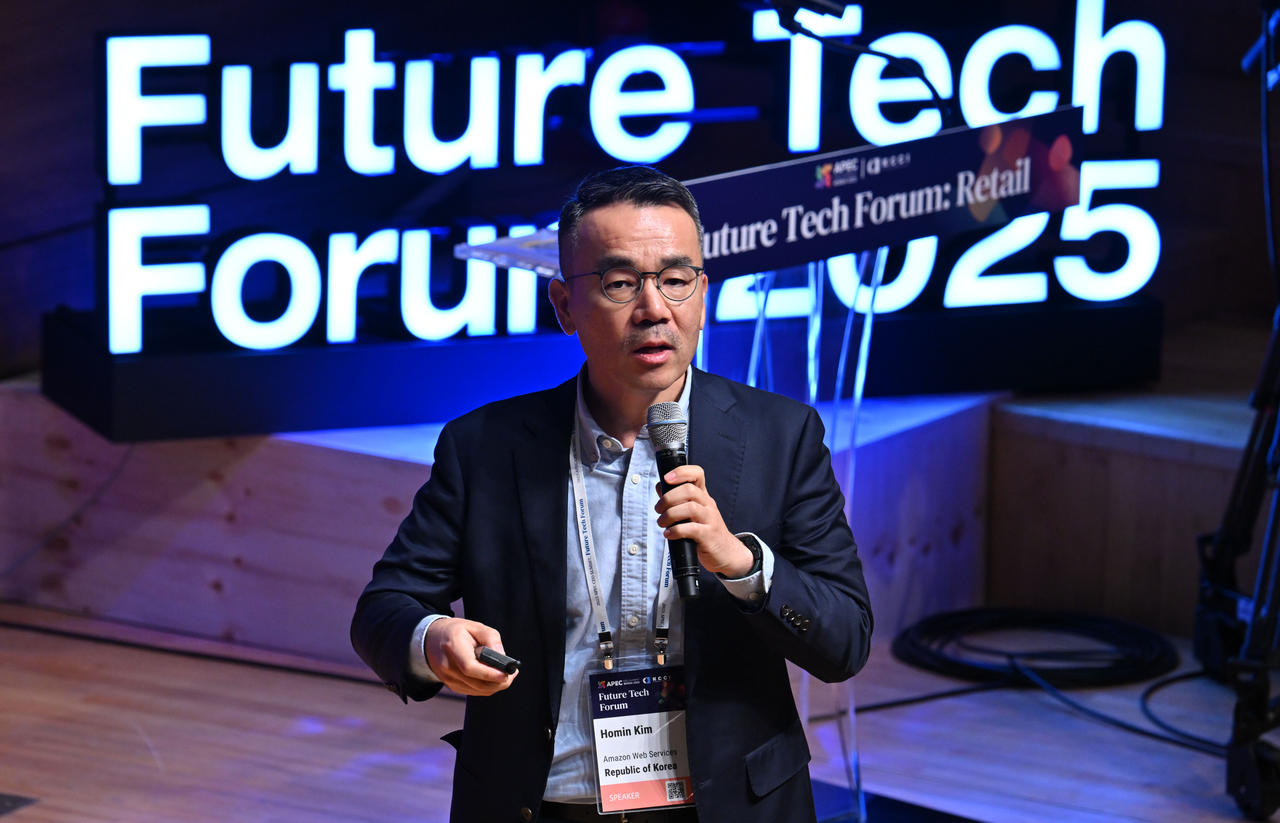 | 김호민 아마존 아태지역 유통부문장이 28일 오후 경북 경주시 경주 예술의전당 원화홀에서 열린 2025 APEC CEO SUMMIT 유통 퓨처테크포럼에서 발표를 하고 있다. 경주=임세준 기자 |