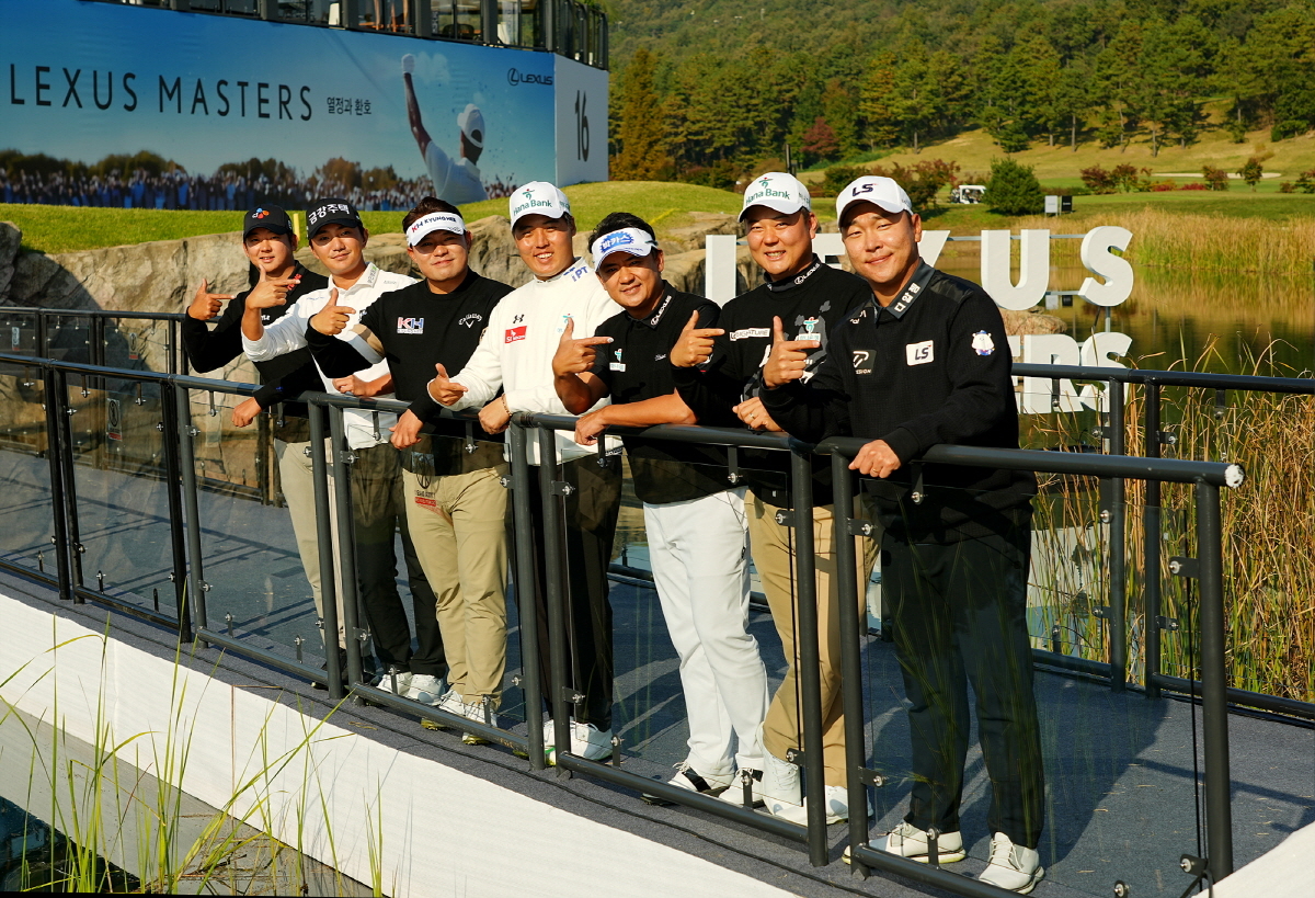 | 렉서스 마스터즈가 열리는 여주 페럼클럽 시그니처홀 16번홀의 특설 브리지에서 선수들이 포즈를 취하고 있다. 왼쪽부터 최승빈, 옥태훈, 이승택, 이승민, 박상현, 함정우, 전가람 [대회 조직위 제공] |