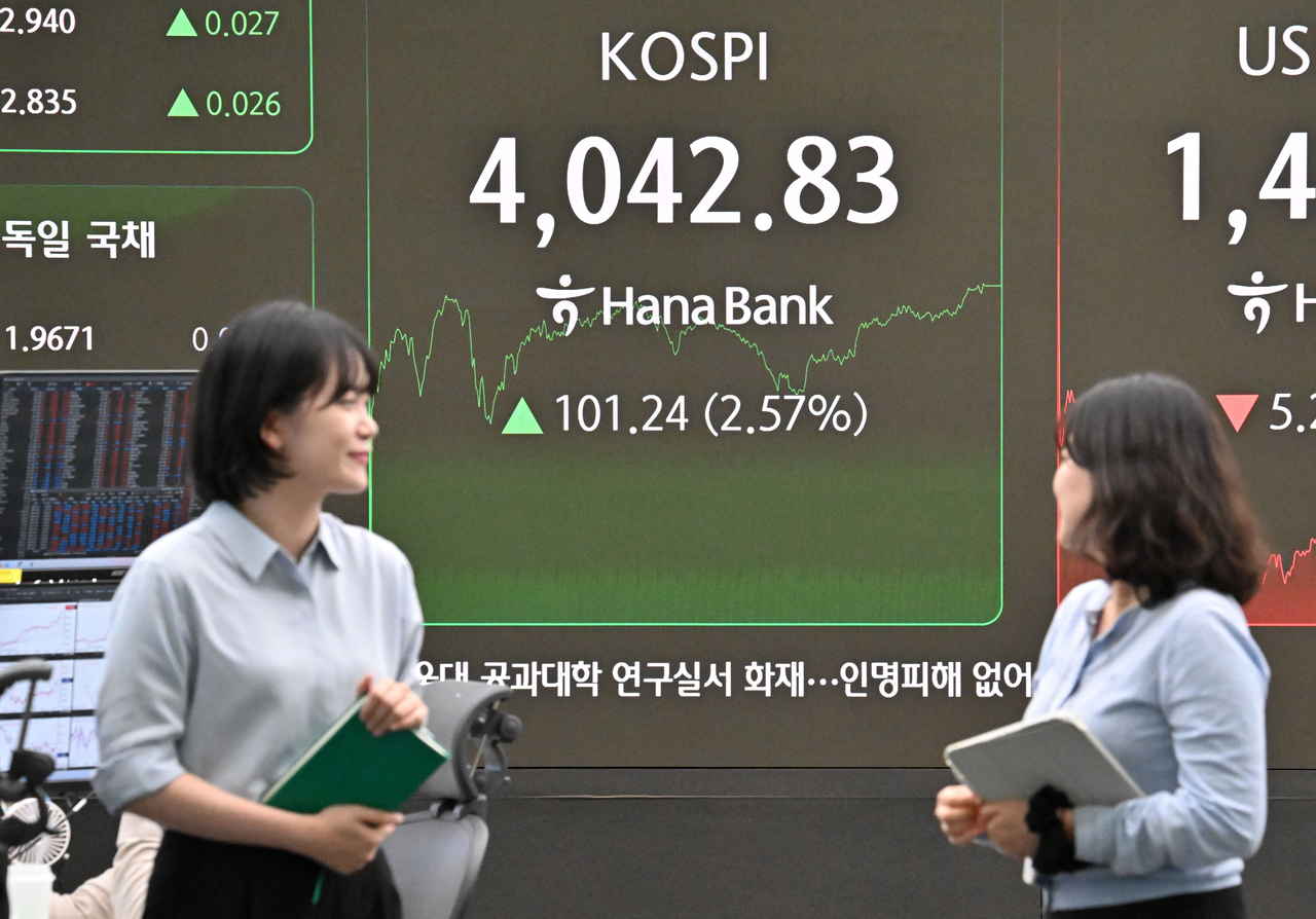 | 27일 코스피가 사상 처음으로 4000선을 돌파 마감했다. 지난 24일 종가 기준 3900선을 넘은 지 1거래일만이다. 이날 오후 서울 중구 하나은행 딜링룸 전광판에 코스피 종가가 전 거래일보다 101.24포인트 상승한 4042.83포인트를 나타내고 있다. 임세준 기자 |