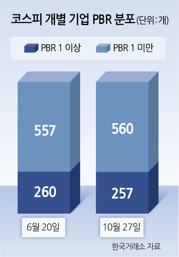 종목별 저PBR 구조는 크게 달라지지 않았다. 27일 기준 PBR 1 이상 종목은 257개(31.6%)로 집계됐다. 0.3 이하 종목은 101개(12.4%)에 달했다. 특히 PBR 0.1대 기업은 13개에서 20개로 늘었다. 6월 20일 당시 전체 817개 종목 가운데 PBR 1 이상은 260개(31.8%), 0.3 이하 종목은 92개(11.3%)였다.