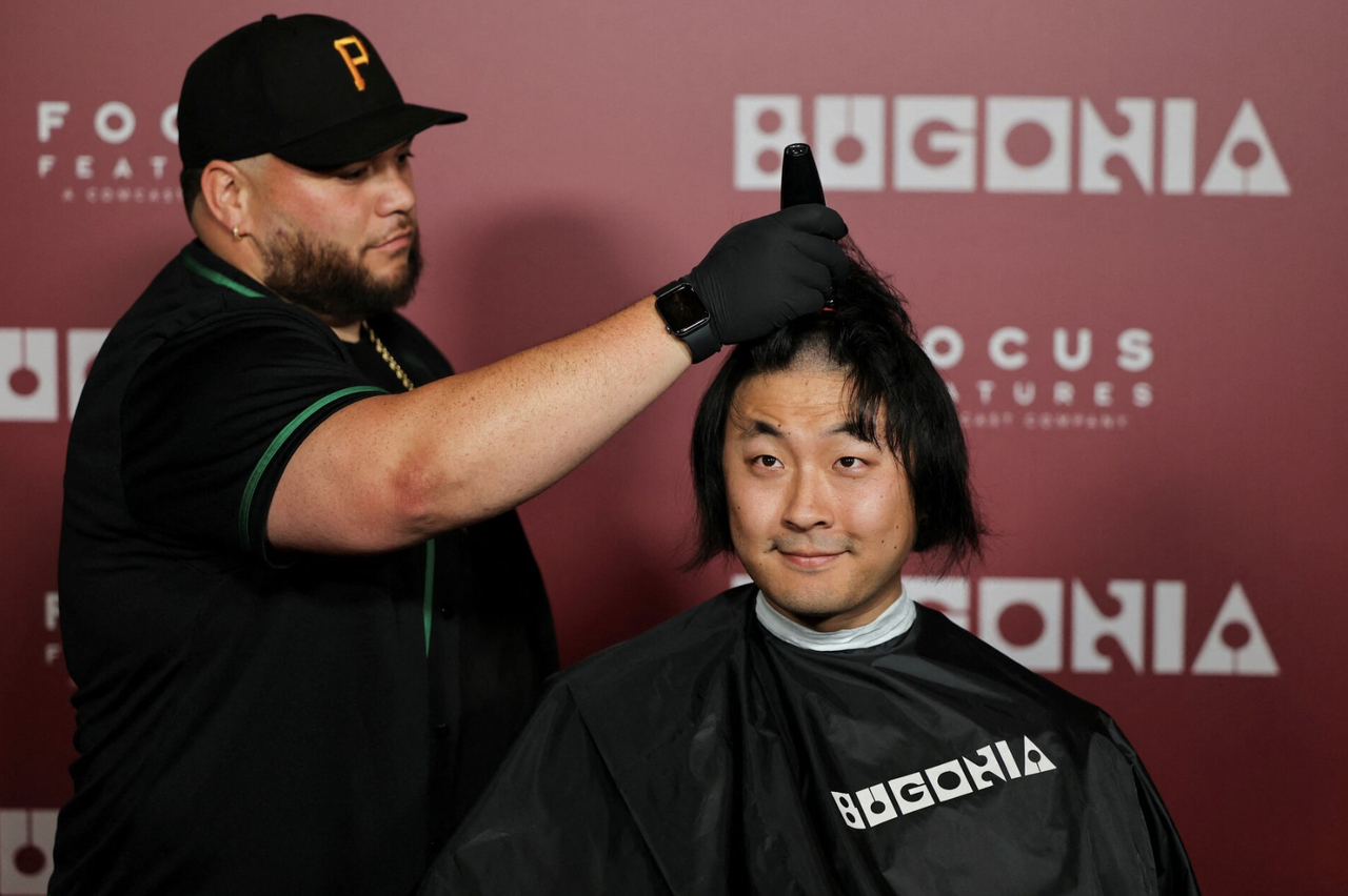 | 지난 20일(현지시간) 미국 로스앤젤레스에서 진행된 영화 ‘부고니아’ 특별 시사회 현장에서 한 관객이 삭발을 하고 있다. [로이터] |