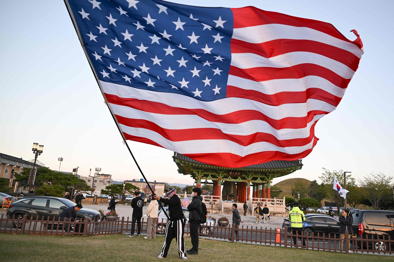 | 29일 아시아태평양경제협력체(APEC) 정상회의 참석을 위해 방한한 도널드 트럼프 미국 대통령을 환영하는 집회에서 한 한국 지지자가 대형 미국 국기를 흔들고 있다. [AFP] |