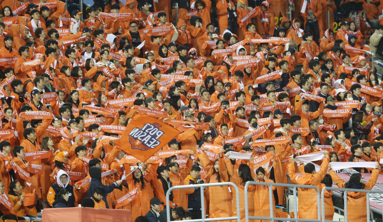 | 27일 서울 잠실야구장에서 열린 2025 프로야구 한국시리즈 한화 이글스 대 LG 트윈스 2차전. 한화 팬들이 응원을 하고 있다. [연합] |