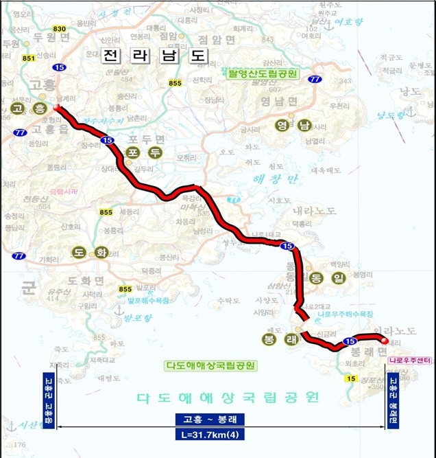 고흥군에 따르면 ‘국도 15호선 고흥~봉래 확장사업’은 고흥읍 호형리~봉래면 예내리(나로우주센터)까지 31.7km 구간을 기존 2차로에서 4차로로 확장하는 사업으로 총사업비는 6521억 원(예비타당성조사 기준)이 투입된다.