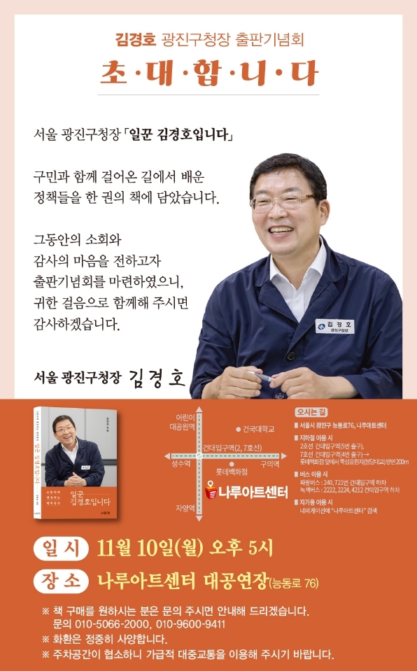 김경호 광진구청장은 11월 10일 오후 5시, 나루아트센터 대공연장에서 ‘일꾼 김경호입니다’ 출판기념회를 연다.