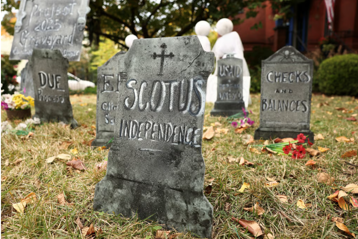 연방의사당 인근에 사는 79세 도나 브레슬린은 자신의 집 앞마당을 ‘트럼프 정책 묘지’로 꾸몄다. 그녀는 “트럼프 대통령이 올해 1월 취임한 이후 내린 여러 정책이 미국 민주주의를 죽이고 있다”고 말하며, 아마존에서 구입한 무덤비 16개를 손수 칠해 세웠다.
