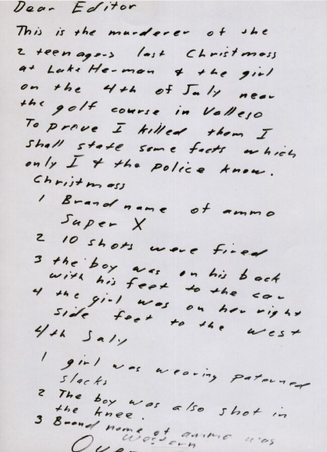 샌프란시스코 크로니클 신문사로 편지 한 통이 들어왔다. “친애하는 에디터님.” 첫 문장은 평범했다. “살인자가 보내오.” 이렇듯, 그다음 문장부터는 그러지 않았지만.