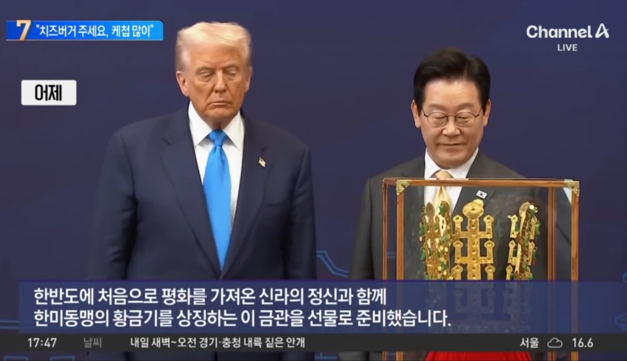 트럼프 미국 대통령은 지난 29일 국립경주박물관에서 열린 이재명 대통령과의 한미 정상회담에서 신라 천마총 금관을 본뜬 특별 제작 모형을 선물로 받고 좋아했다고 한다. 장내 아나운서는 “한반도에 처음으로 평화를 가져온 신라의 정신과 함께 한미동맹의 황금기를 상징하는 이 금관을 선물로 준비했습니다”고 소개했다.