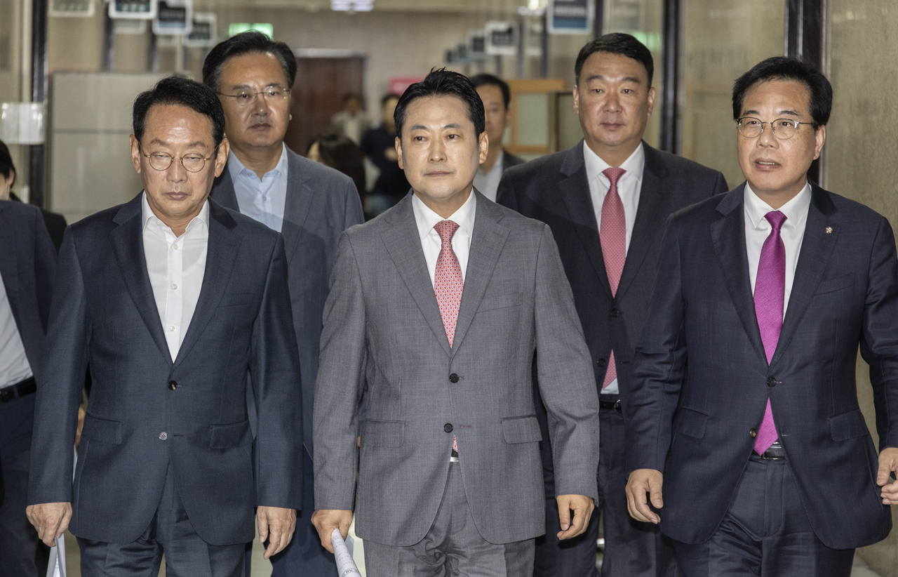 | 국민의힘 지도부. 장동혁 대표(앞줄 가운데)와 송언석 원내대표(앞줄 오른쪽), 김도읍 정책위의장. [연합] |