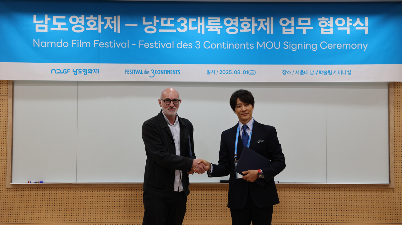 | 낭뜨3대륙영화제 제롬 바롱 집행위원장과 업무협약을 체결한 남도영화제 최수종 집행위원장 |