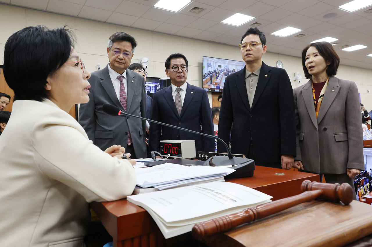 | 지난달 29일 국회 과학기술정보방송통신위원회에서 열린 과학기술정보통신부 등에 대한 종합감사에서 최민희 위원장이 최수진 의원 등 국민의힘 의원들로부터 사퇴요구를 받고 있다. [연합] |