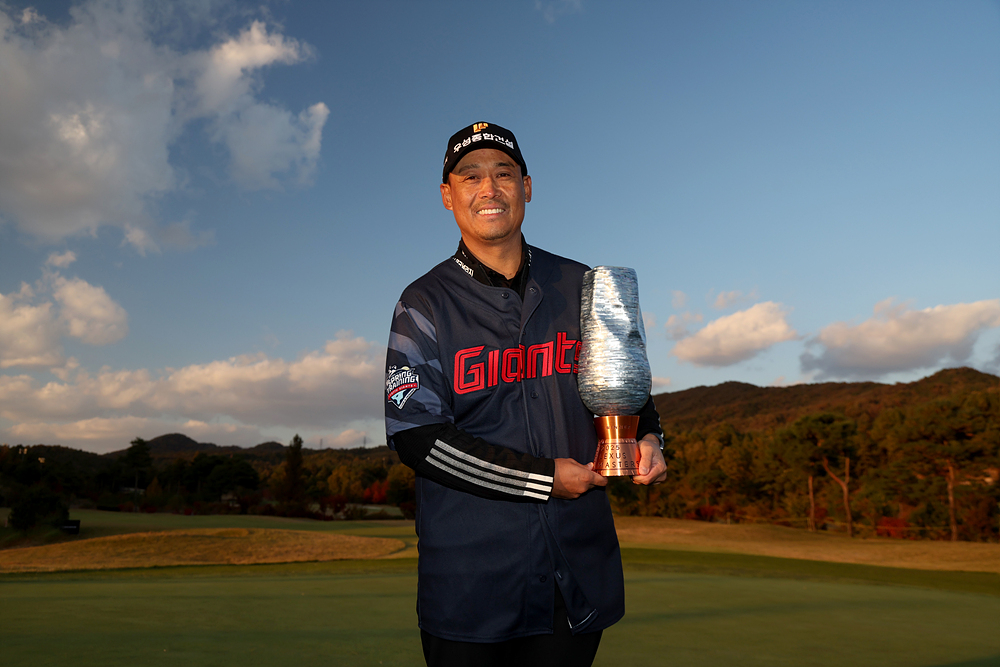| 부친 롯데 자이언츠 김용희 감독의 유니폼을 입고 우승 트로피를 든 김재호. [사진=KPGA] |