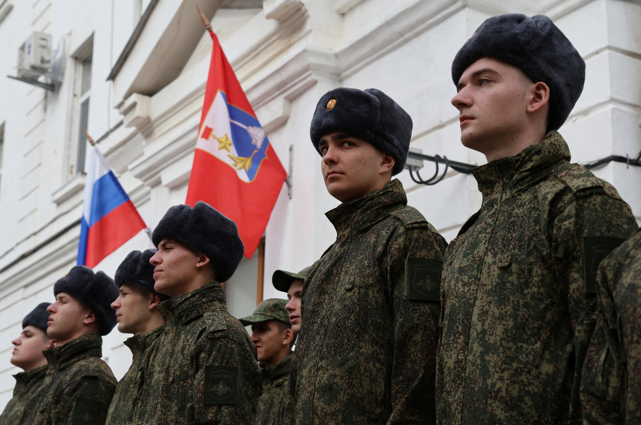 | 22일 크림반도 흑해 항구 도시 세바스토폴에서 열린 군 복무 소집 병사들의 부대 배치를 기념하는 행사에서 러시아 병사들이 줄을 서 있다. [로이터] |