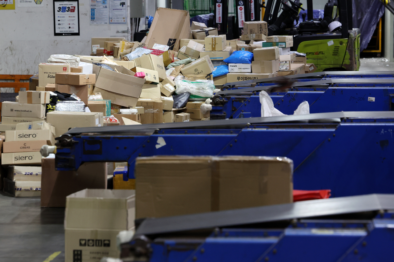 | 서울 한 물류센터에 배송될 택배 물품이 쌓여 있다. [연합] |