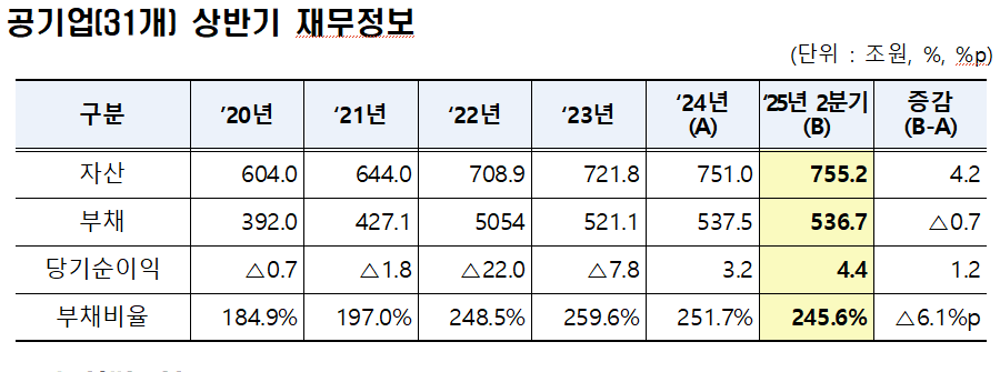 공기업의 재무지표도 개선세를 이어갔다. 6월 말 기준 공기업 자산은 755조2000억원으로 전년 대비 4조2000억원 늘었고, 부채는 536조7000억원으로 7000억원 줄었다. 부채비율은 245.6%로 6.1%포인트 하락, 당기순이익은 4조4000억원 흑자를 기록했다. 투자집행 규모는 55조2000억원으로 전년보다 7조8000억원 증가하며 견조한 흐름을 보였다.