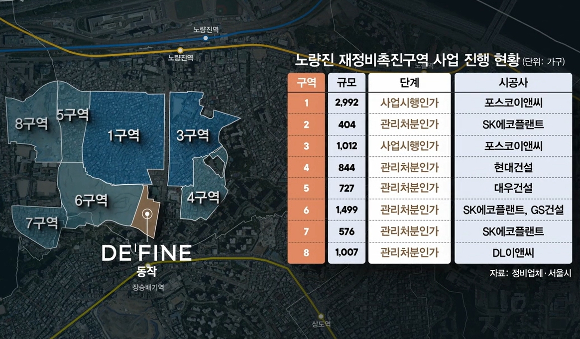 | 서울 동작구 노량진뉴타운 정비사업 추진 현황. [‘드파인 동작’ 공식 홍보 영상] |