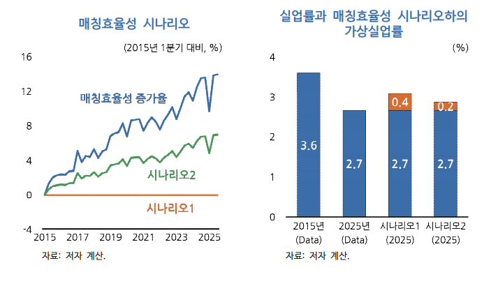 20대 ‘쉬었음’ 인구 비중이 2015년 수준(4.4%)을 유지했을 경우 2025년 실업률은 0.4~0.7%포인트 높았을 것으로 추정됐다. 또한 매칭효율성 증가세가 절반 수준이었다면 실업률은 0.2~0.4%포인트 높아졌을 것으로 나타났다.