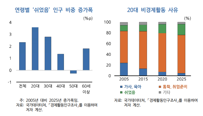 국가데이터처 비경제활동 부가조사에 따르면 20대 ‘쉬었음’ 인구 중 30.9%는 “원하는 일자리를 찾기 어려워 쉬고 있다”고 응답했다. KDI는 “청년층이 노동시장 진입 자체를 포기하는 현상이 확산되고 있다”며 “실업률이 낮다는 이유만으로 고용여건이 개선됐다고 보기는 어렵다”고 지적했다.
