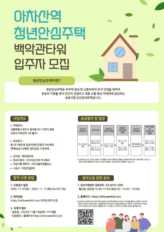‘아차산역 백악관타워’는 서울시의 청년안심주택 사업을 통해 공급된 단지로, 공공임대 101세대와 공공지원민간임대 160세대 총 261세대 규모로 청년과 신혼부부의 주거 안정에 큰 역할을 할 것으로 기대된다.