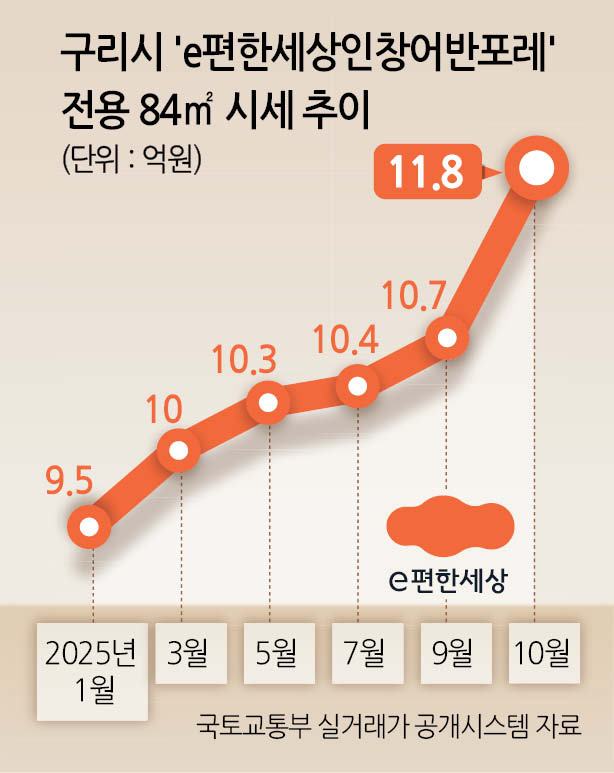 10·15 주택시장 안정화 대책이 발표된 이후 규제를 비껴간 경기도 구리시로 수요자들의 관심이 쏠리고 있다. 특히 구리의 대장주로 꼽히는 ‘e편한세상인창어반포레’는 대책 발표 이후 84㎡(전용면적)가 12억원에 거래되는 등 호가가 상승하는 모습이다.