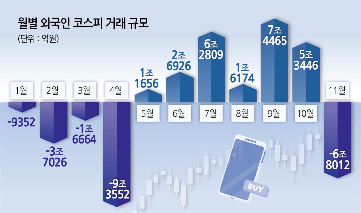 외국인은 이달 들어 4거래일 연속 매도 행진을 이어가며 총 6조8012억원을 팔아치웠다. 지난 10월 한 달 동안 5조3446억원을 순매수하며 코스피 상승을 견인했던 것을 고려하면 불과 한 달 만에 그 자금이 모두 빠져나간 셈이다.