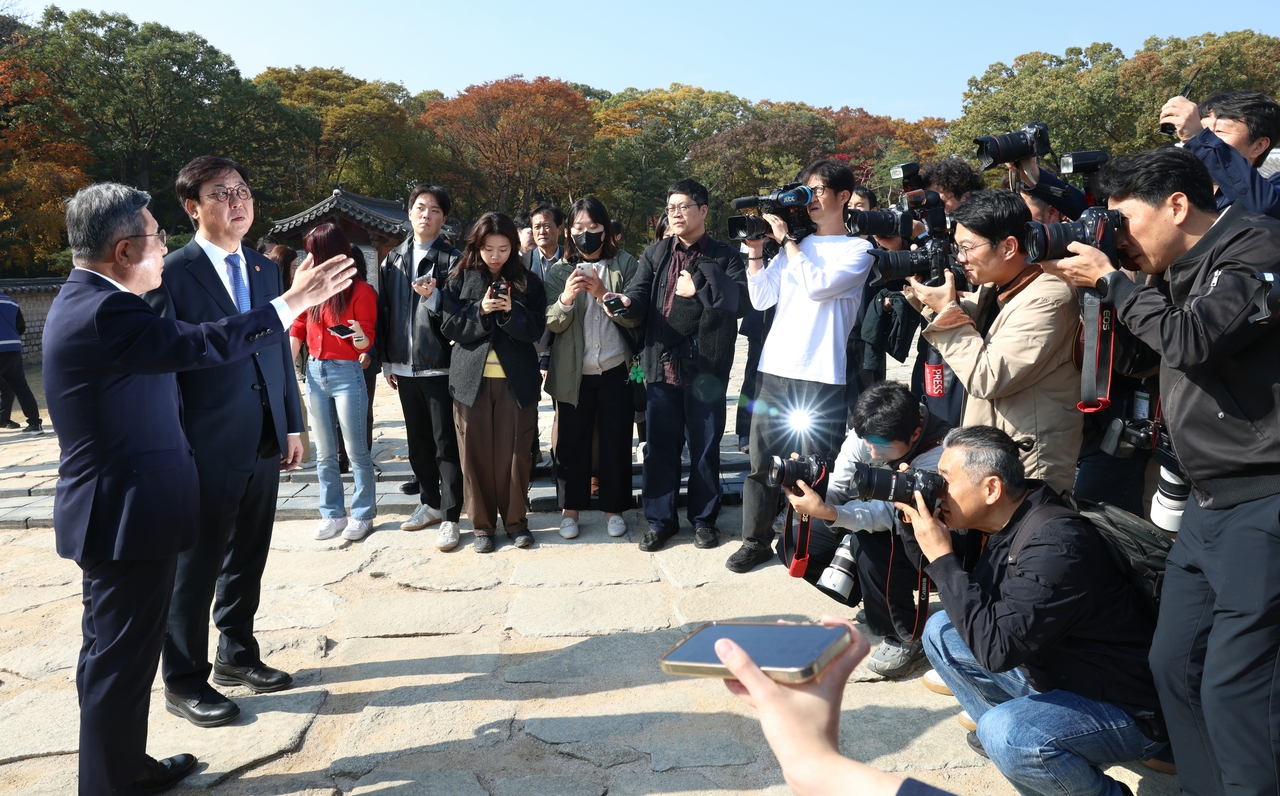 | 최휘영 문화체육관광부 장관이 7일 서울 종로구 세계유산 종묘를 찾아, 최근 서울시의 세운상가 재개개발계획에 따른 영향을 살펴보고 대책을 점검하고 있다. [문화체육관광부 제공] |