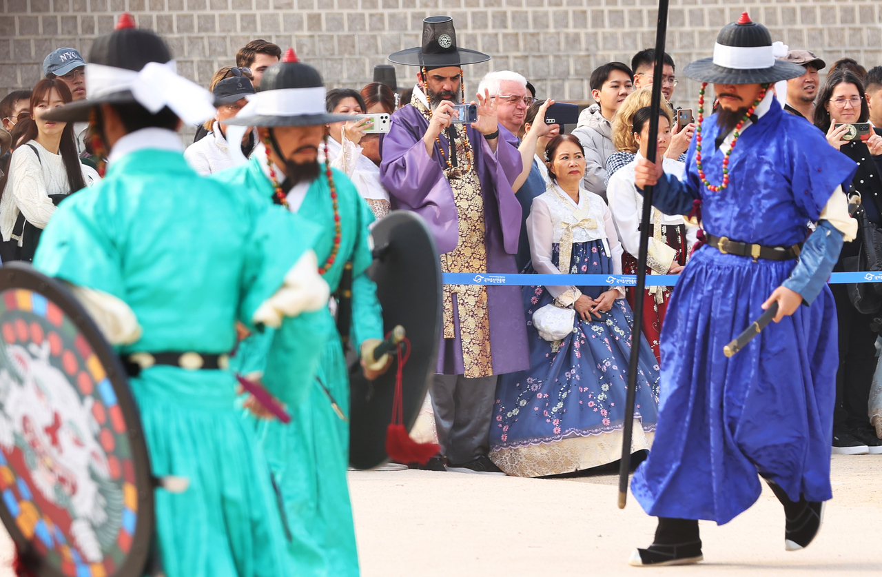 | 서울 종로구 경복궁에서 외국인 관광객들이 궁궐 호위군 사열의식 ‘첩종’ 재현 행사를 관람하고 있다. ‘첩종’은 종을 연달아 치는 것으로 조선시대 국왕이 비상사태를 대비해 호위군을 직접 살피는 군사 의식이다. [연합] |