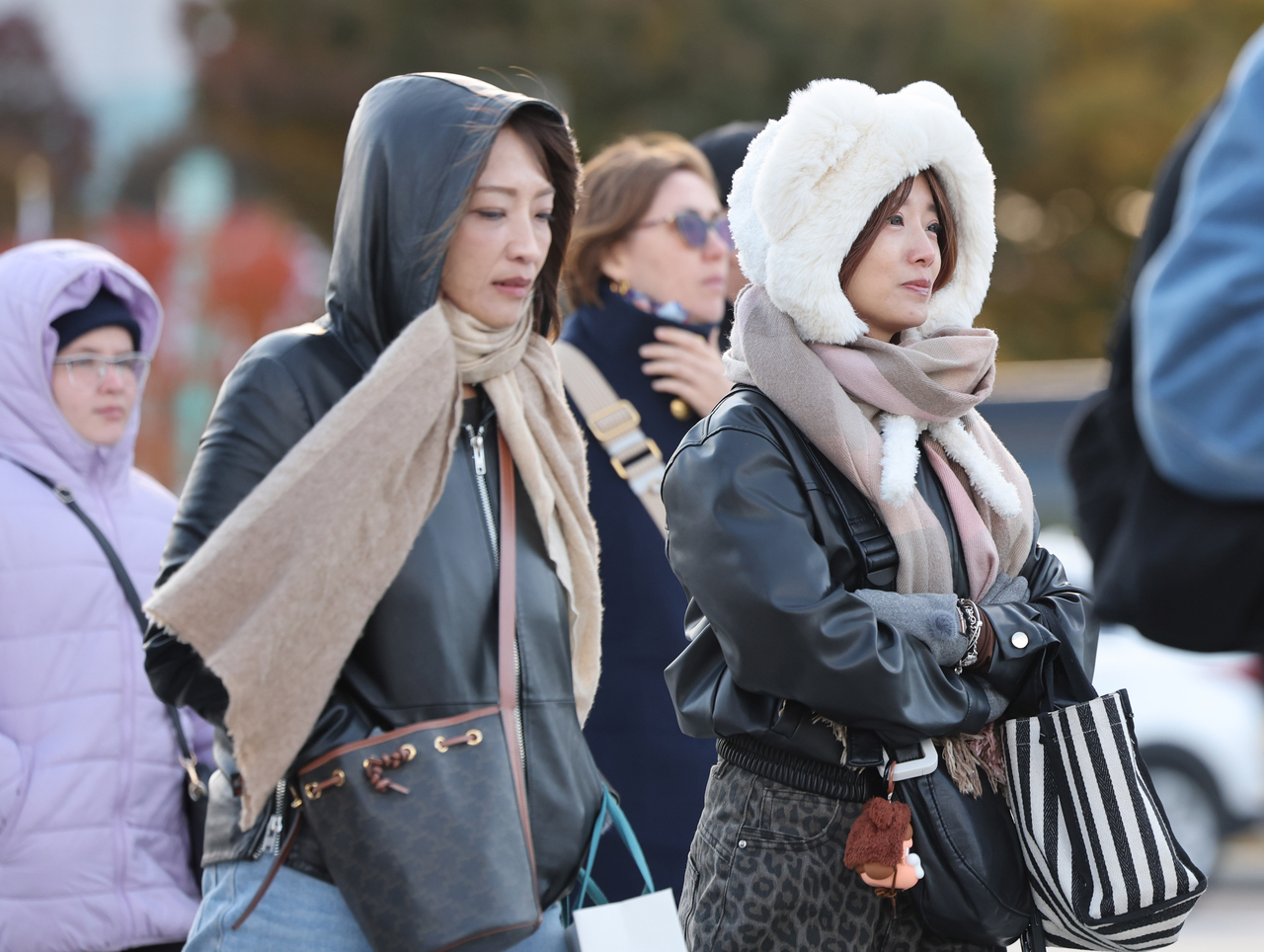 | 서울 광화문 광장에서 외국인 관광객들이 외투를 입은 채 걸어가고 있다. [연합] |