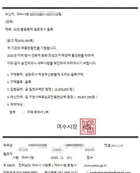 이 손님은 ‘25년 불꽃축제 설문조사 음료’라는 제목의 여수시장 직인이 찍힌 위조 공문을 내밀며 음료수 대리 구매도 요청했다.
