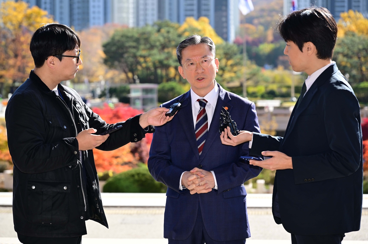 | 검찰의 대장동 사건 항소 포기 논란이 이어지고 있는 가운데 정성호 법무부 장관이 10일 오전 경기 과천시 법무부로 출근하며 취재진의 질문에 답하고 있다. 이상섭 기자 |