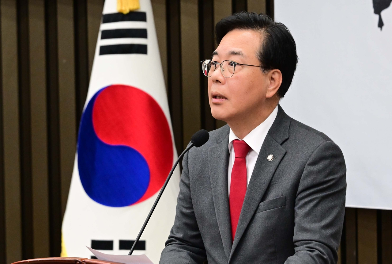 | 송언석 국민의힘 원내대표가 10일 오후 국회에서 열린 의원총회에서 대장동 사건 항소 포기를 규탄하는 발언을 하고 있다. 이상섭 기자 |