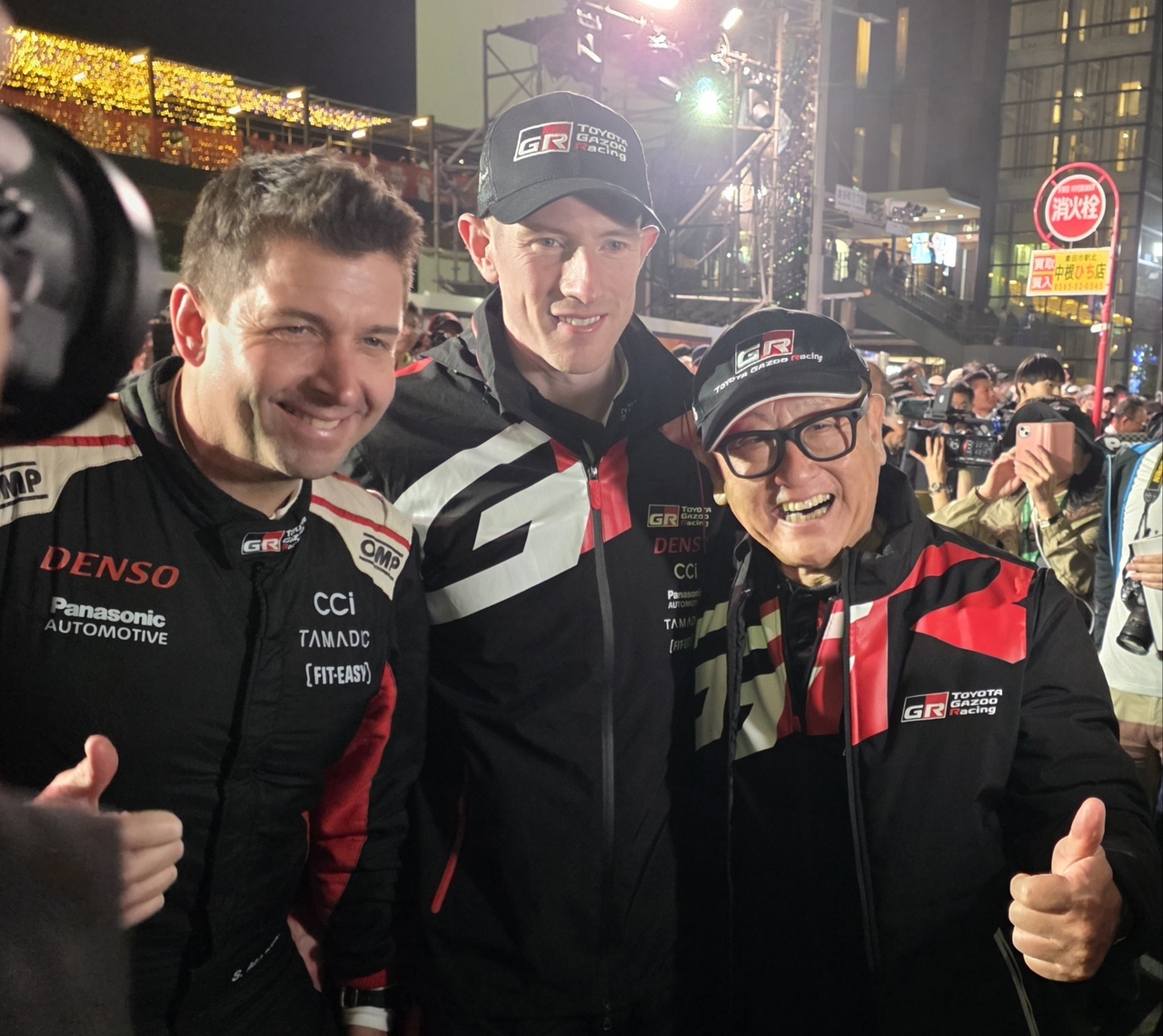 | 아키오 토요타 회장(오른쪽 첫 번째)이 TGR-WRT 소속 엘핀 에반스(가운데), 코드라이버 스콧 마틴(왼쪽 첫 번째)과 사진 촬영을 하고 있다. 아이치현=서재근 기자 |